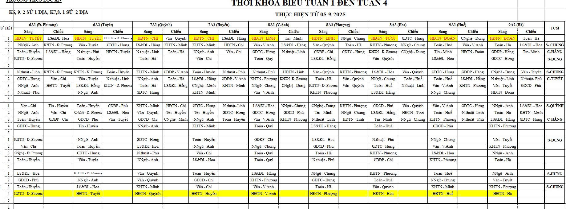 Thời khoá biểu từ tháng 9 năm 2025.